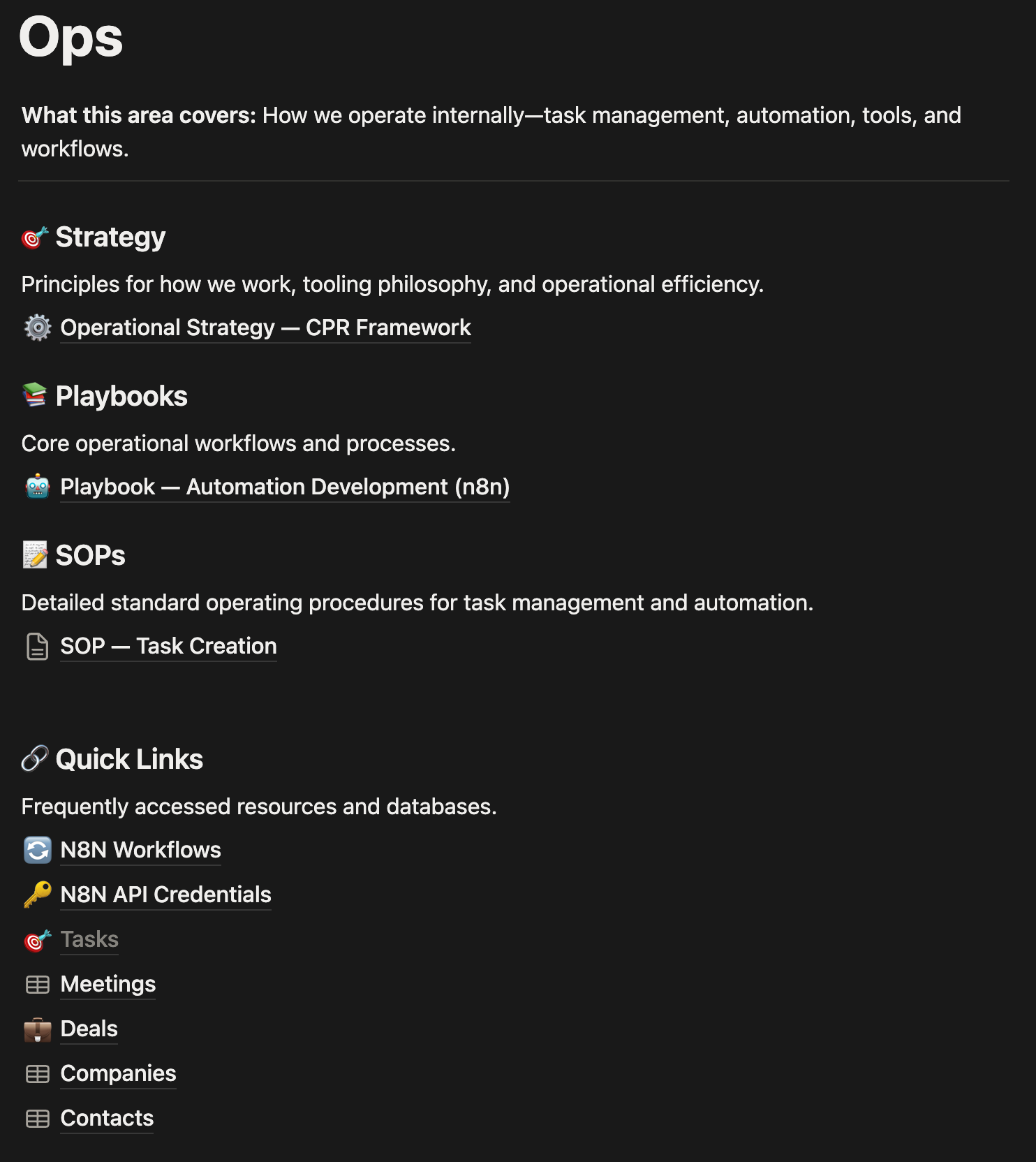 I have five basic areas: Home, Strategy, Growth, Product, and Ops. In the marketing related stuff, it’s going to look through the Growth section. For tasks and organizational items, it looks through ops. Strategy is my North Star area that keeps us aligned on direction and goals.