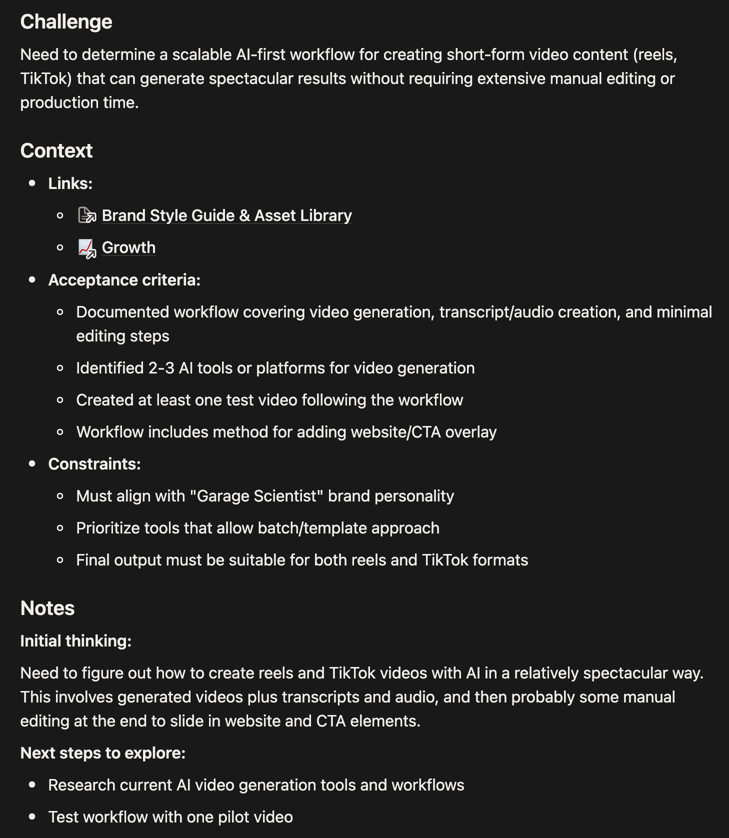It takes my description, searches the rest of my workspace for context, and fills out the task near perfectly. Now, despite my lack of rigor on the small things, if you came into my workspace, you would know what’s being worked on and how to complete each task.